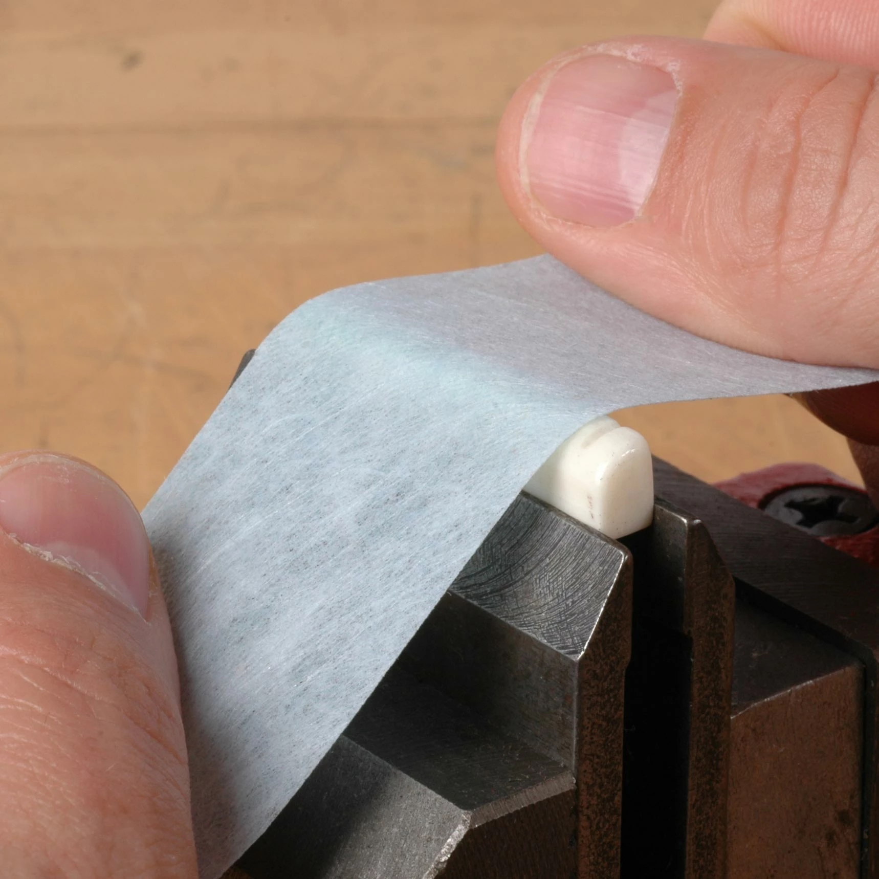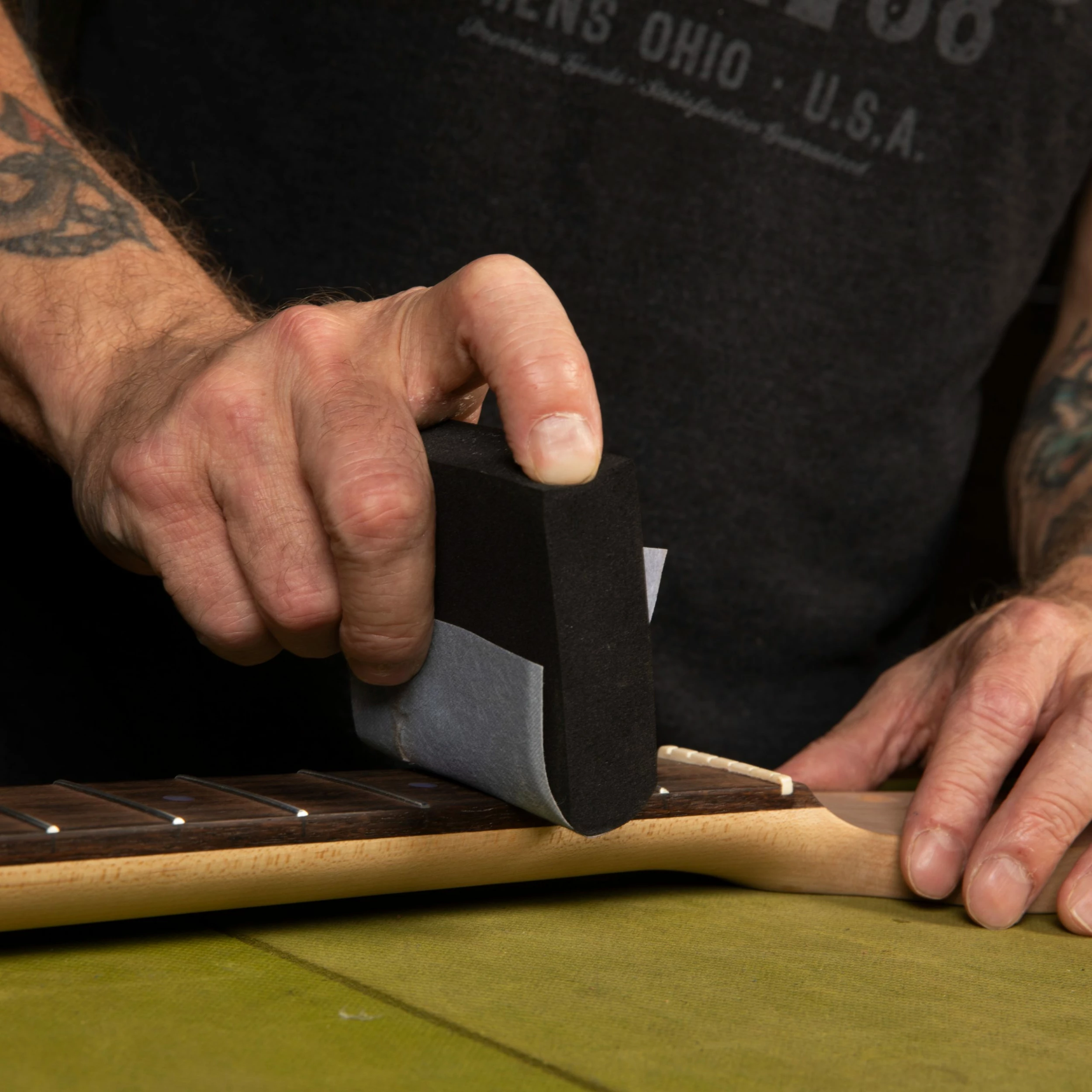 Because they conform to any surface shape, they’re great for polishing contoured guitar finishes, frets, plastic pickguards, pearl inlays and more. The first samples we received were jealously hoarded in our shops, quickly becoming favorites for polishing nuts and saddles, and for touchups in lacquer finishes.