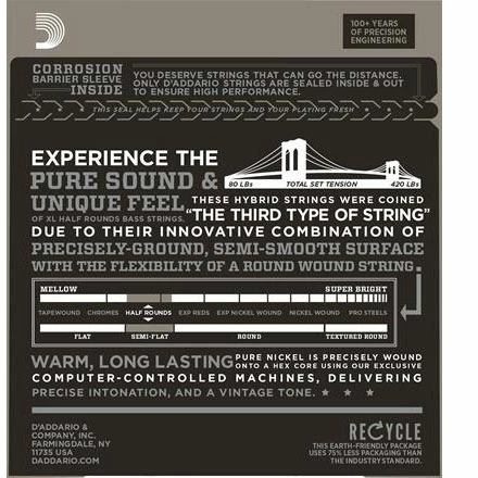 D’Addario Half Round bass strings are wound with pure nickel, then precision ground, leaving the outer surface smooth and semi-flat while retaining the flexibility of round wound strings. D’Addario’s exclusive heat treating process ensures that Half Rounds retain their round wound brightness and sustain.