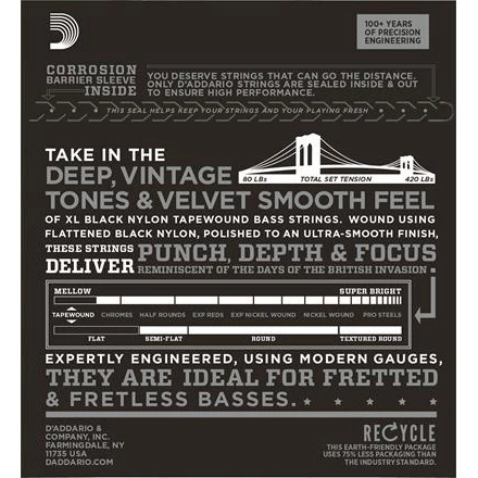 Designed to produce a deep, warm tone with smooth feel, D’Addario Tapewound Bass strings are wound using a flattened black nylon which is polished to an ultra-smooth finish. These long-lasting, well-balanced strings are expertly engineered to provide optimal tension and are gauged to fit properly on standard bass saddles and nuts. Tapewounds may be used on fretted or fretless basses and are designed to deliver a vintage tone ranging from the thump of an upright bass to the focused depth of traditional flatwound strings.