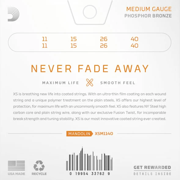 “D’Addario XS Mandolin strings combine our most popular acoustic alloy with our most advanced string coating technology, resulting in clear tone, smooth feel, and superior tuning stability—all with the longest possible string life.”