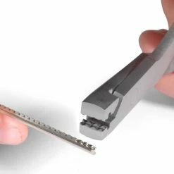 The Fret Crimper: Hardened steel jaws press a slight scallop into a fret tang to fit an oversize slot. You simply vary the pressure as needed. Overall length 7″ (178mm); jaw width 13/32″ (10.24mm), with comfortable rubber-coated handles.