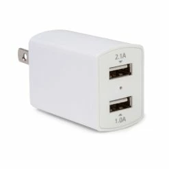 #1556 Dual USB Wall Charger – Charger only. Charger is a 120-volt AC electrical appliance. It has a U.S. standard Type A plug with two flat parallel prongs, ungrounded.