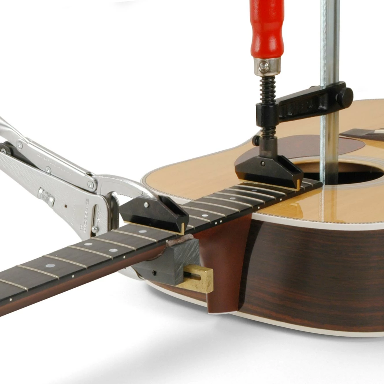 - Jaws2: Don’t hammer frets on the over an unsupported acoustic guitar top! Jaws2 reaches through the soundhole to safely press frets into place without stressing the guitar top. Includes three wooden cauls. Read more…