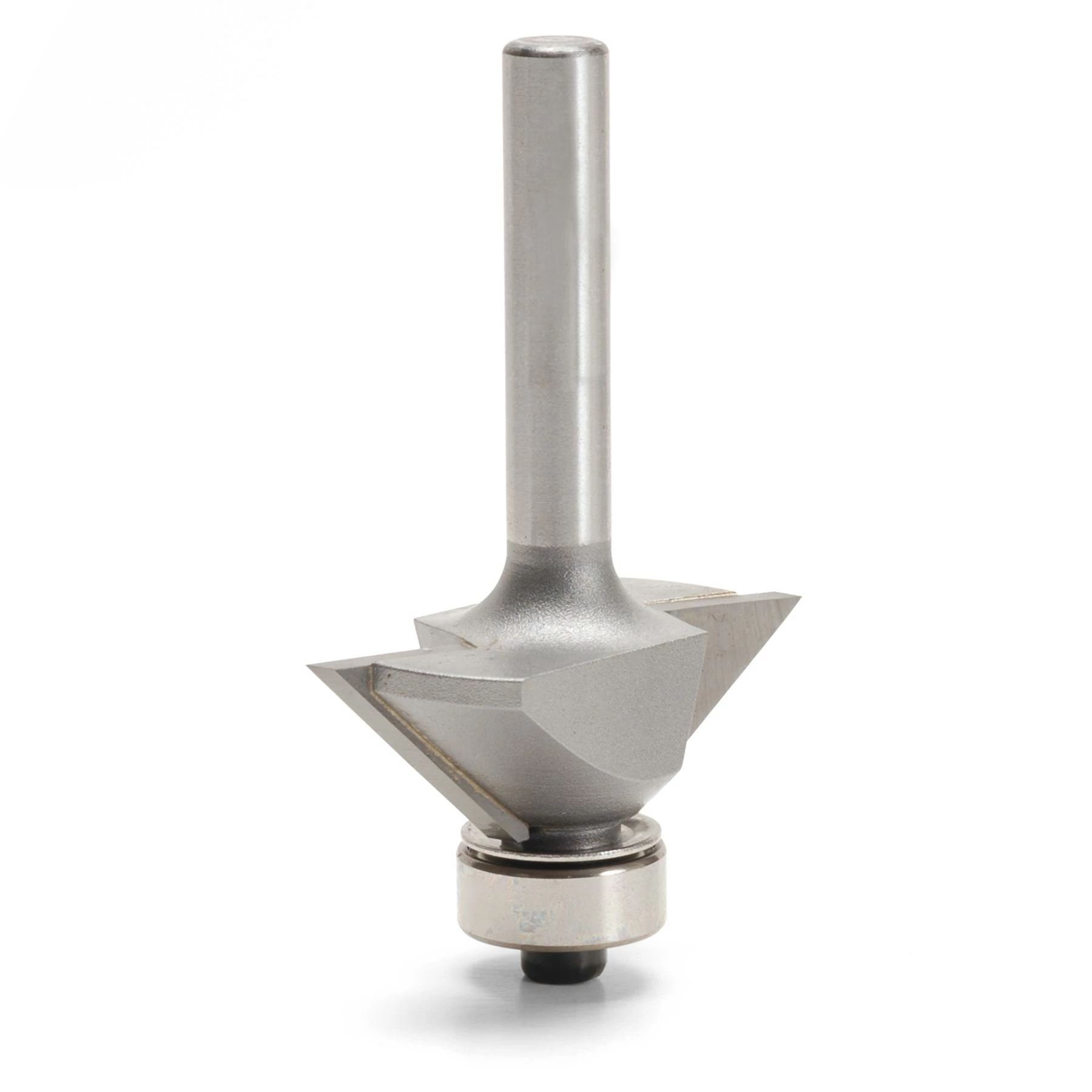 The carbide-tipped cutter has a 1/4″-diameter shank and 1/2″-diameter ball bearing guide.