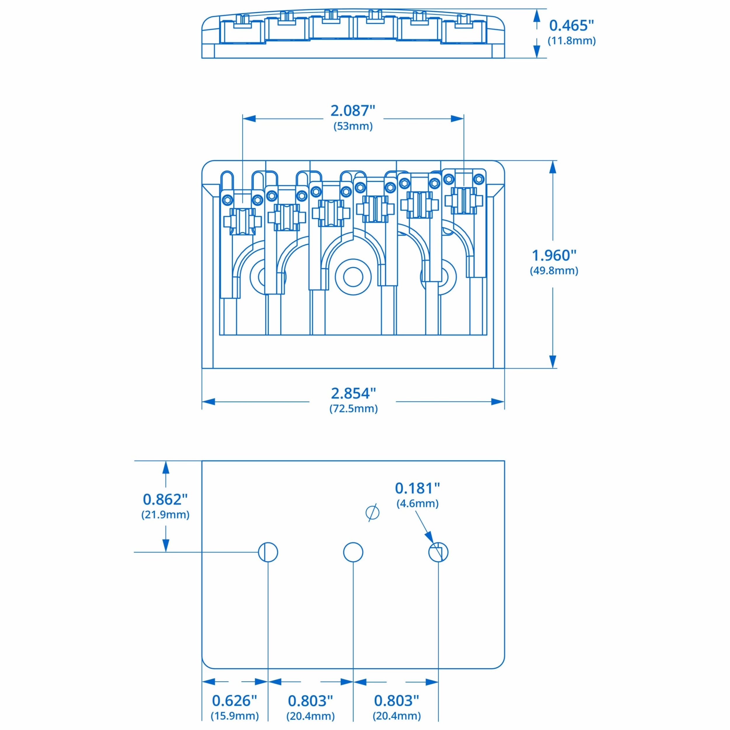 The saddles and the 2-13/16″ x 1-15/16″ (71.44mm x 49.21mm) baseplate are brass. A removable 1/8″ (3.00mm) spacer is included for raising the baseplate height if needed. Use a .050″ allen wrench to adjust the saddle heights from 3/8″ to 17/32″ (9.53mm to 13.49mm) from the guitar body (E string positions).