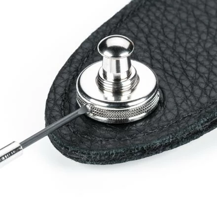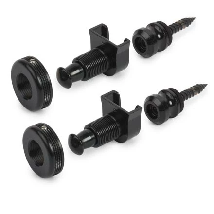 The plungers on the locks are all one piece, and the locks have a longer threaded section to accommodate thicker straps. The strap buttons are one piece (button and screw) with a slightly enlarged thread to dig into oversized strap button screw holes, and use a 3mm allen wrench for installation. The collars have been re-designed to include a set screw, which helps secure the strap onto the lock.