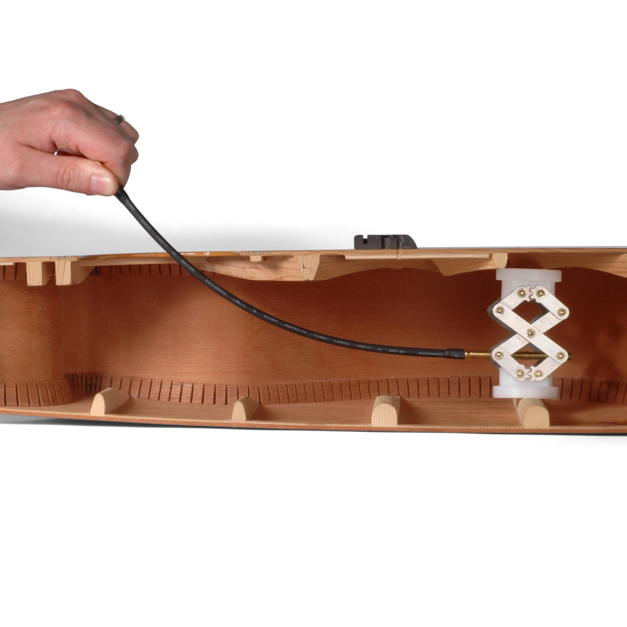 The Scissor Jack has smooth thumbscrew height adjustment. Best of all, it’s easy to add the flexible extension cable supplied with the jack, so you can operate it deep inside the guitar where your arm can’t reach!