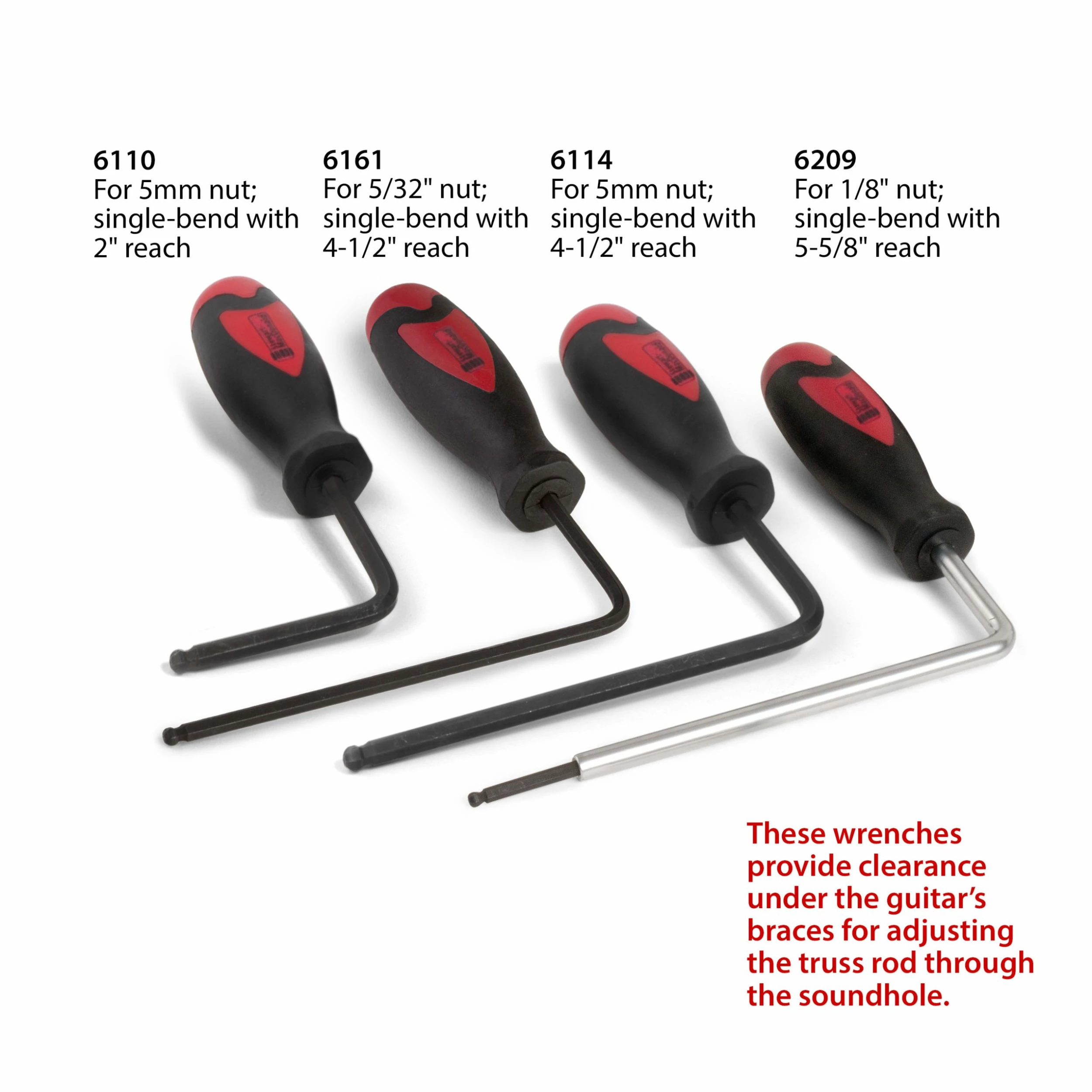 Allen ball end for easy access! Our special right-angle wrenches provide clearance under the guitar’s braces for adjusting the truss rod through the soundhole.