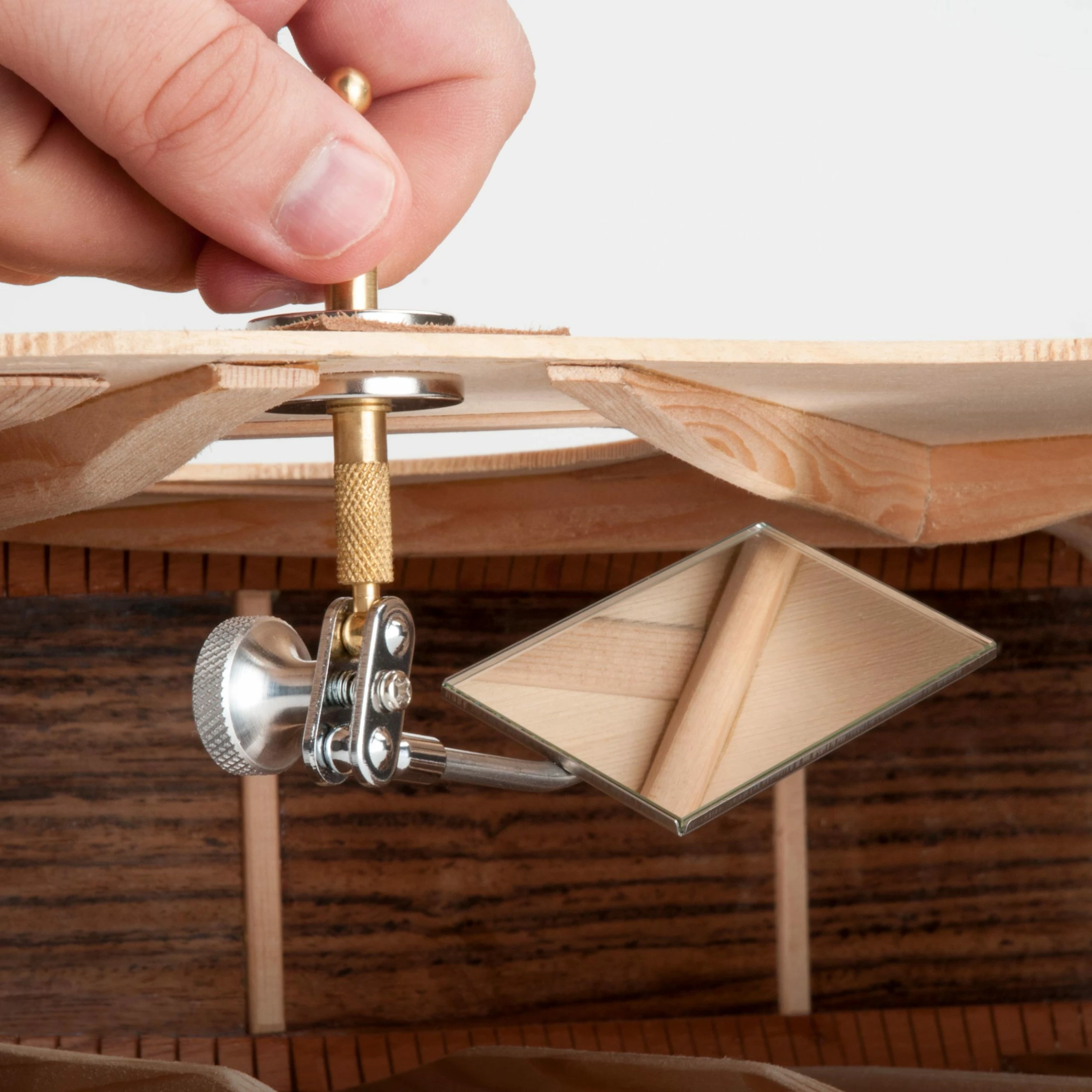 Repairman Gene Imbody suggested this versatile inspection mirror, an ingenious use of our guitar repair magnets. Powerful interior and exterior magnets let you position the mirror quickly and easily where you need it. Thumbscrew-locking ball joints provide a completely flexible viewing angle, too. It’s a pro quality tool, made of sturdy brass and steel.
