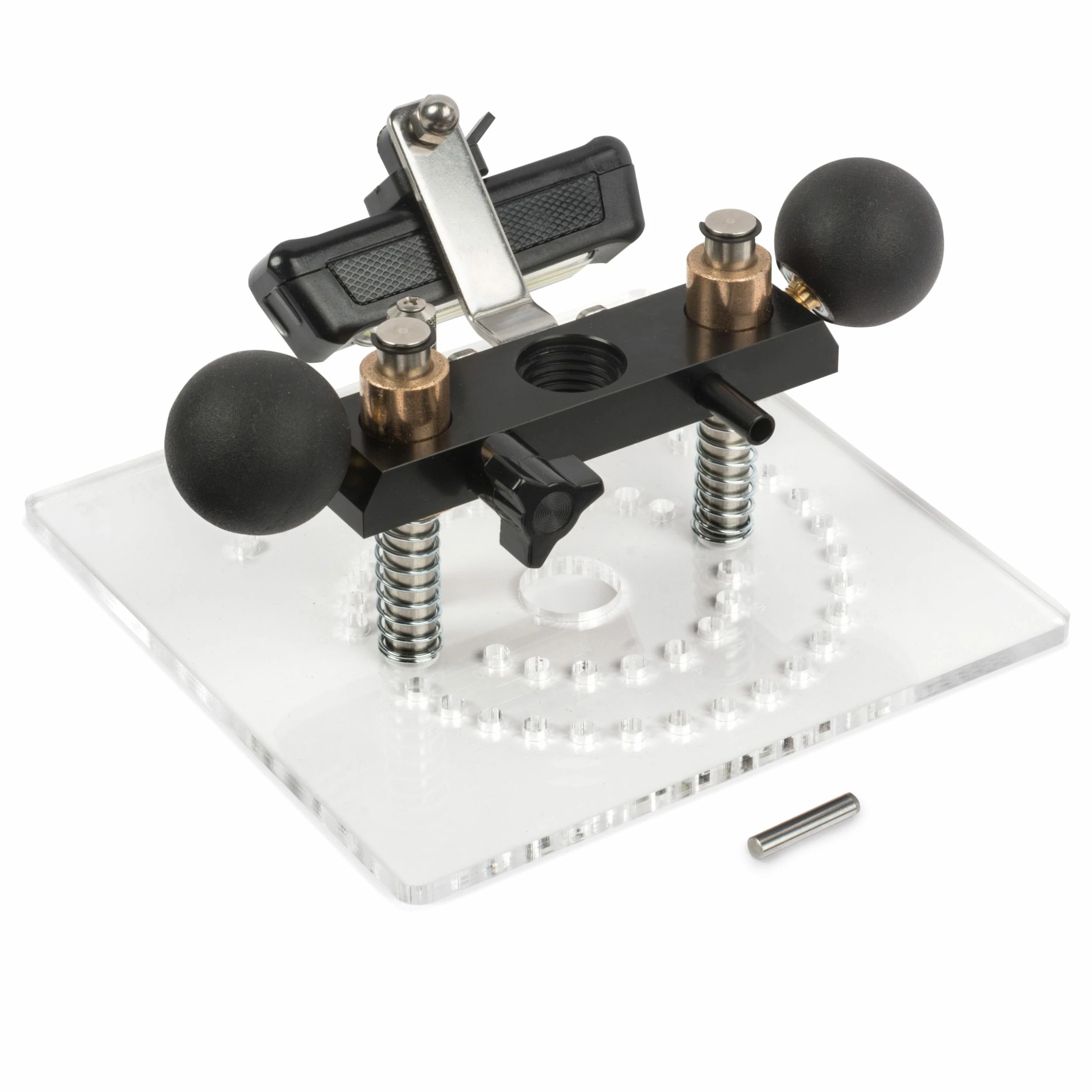 The simplicity lies in the Rosette Router Base’s clear plexi plate with a spiral pattern of index holes. Insert a pin into one of the holes, and the router works as a compass, rotating around the pin and cutting a precise circle. Each of the 49 holes will change the diameter of the corresponding rosette it cuts by 1/16″.