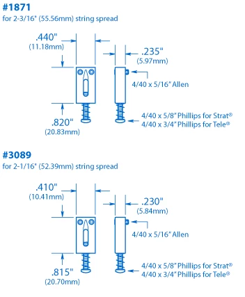 | #3089 | For Strat and Tele 13/32″ x 13/16″ x 7/32″ (10.41mm x 20.70mm x 5.84mm) Includes 5/16″ Allen height adjustment screws Includes 5/8″ intonation screws for Strat and 3/4″ screws for Tele Fits Strat/Tele with 2-1/16″ (52.39mm) string spread at the bridge |