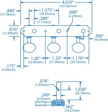 The stainless steel worm gears have twin bushings for unrivaled life year after year. The string post gears are machined from bronze alloy, which is much more durable than brass. Brass string shafts are 1/4″-diameter with 1-3/8″ (34.93mm) spacing.