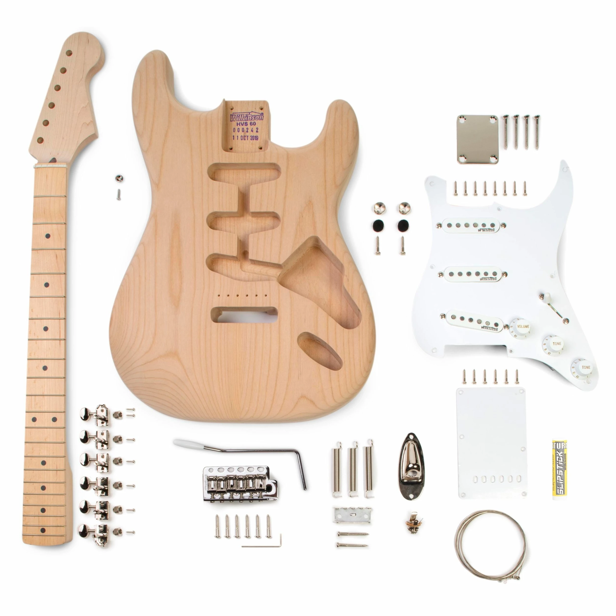 - Pre-wired single-ply white pickguard with three Wilkinson WVS pickups