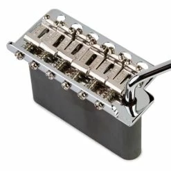 The hardware upgrades are where this kit really shines. The bridge is Wilkinson’s take on the classic Strat trem, with traditional bent steel saddles. The bridge baseplate features elongated holes so the screws won’t bind, for smooth, accurate return to pitch. The steel block also features staggered holes for an incredible feel. The Graph Tech nut keeps the guitar in tune even when you lean into the trem.